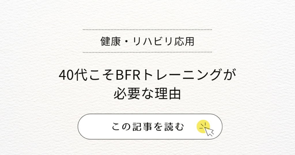 「興味はあるけど、ちょっと不安…」40代になると、・体力の低下・回復力の変化・怪我への不安を感じやすくなります。BFR(血流制限トレーニング)は軽い負荷で効果が期待できる方法ですが...